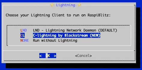 Then you can choose which Lightning implementation you want to run on top of your Bitcoin Fullnode. Choose NONE if you’re only interested in running a Bitcoin full node without Lightning.