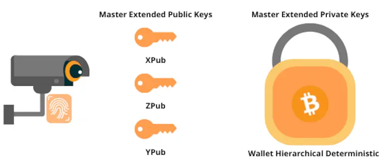 En las billeteras jerárquico deterministas (HD) el esquema de derivación que codifica las claves públicas y privadas se le conoce como xpub Master Extended Public Keys o lo que es lo mismo, de xpub, ypub y zpub.